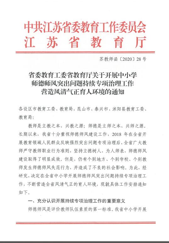江苏省《中小学教师违反职业道德行为处理办法》实施细则(试行)苏教规〔2019〕1号第一章 总则 第一条 为规范全省中小学教师职业行为,