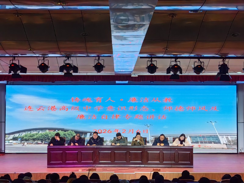 2月6日下午,连云港高级中学全体教职工大会在云帆楼二楼报告厅隆重举行。大会由校党委书记蒋捍同志主持,全体教职工齐聚一堂,共谋学校发展新蓝图。